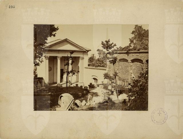 Veduta dei ripiani inferiori dell'Orto Lapidario del Museo di Storia ed Arte di Trieste con il tempietto neoclassico sullo sfondo.