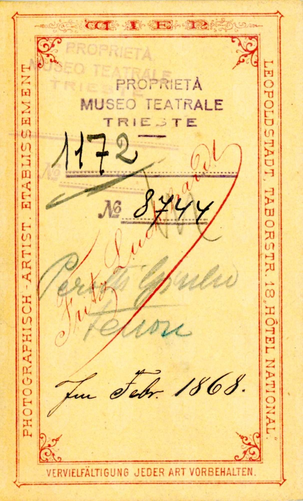 In costume. Alias Julius Prott, tenore, si è esibito in molte città d'Europa e d'America. Nel 1874 ha cantato al teatro Mauroner di Trieste nel "Trovatore". Appassionato di giardinaggio, alla fine della sua carriera si è stabilito a Trieste dove ha aperto un'azienda per la coltura delle rose riconosciuta a livello internazionale; si può anche ricordare lo storico negozio di fiori in Capo di Piazza.