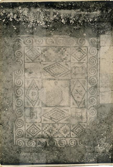 Pannello musivo che ornava il complesso noto in letteratura con il nome di "Grandi Terme", costruito ad Aquileia nel settore sud-occidentale della città antica in età tardocostantiniana. L'edificio, messo in luce negli anni Venti e attualmente in corso di scavo da parte dell'Università di Udine, è noto solo parzialmente: si conosce un ampio "frigidarium", collocato idealmente al centro del complesso, collegato in corrispondenza dei lati brevi mediante due lunghi corridoi a due aule simmetricamente opposte e di identiche dimensioni, interpretate come palestre/"apodyteria". A est del frigidario era situata la piscina mentre alcune emergenze poste a ovest sembrerebbero riconducibili alla zona del calidario/tepidario. Completavano il complesso una serie di altri vani, alcuni dei quali riscaldati, posti nelle immediate vicinanze delle due ampie palestre. Le terme erano dotate di un ricco apparato decorativo di cui rimane testimonianza nei rivestimenti in marmo e in mosaico, come si evince dalla foto in esame. Il particolare qui riprodotto ornava l'aula Nord, caratterizzata da una composizione musiva piuttosto articolata (identica, nell'organizzazione, a quella dell'aula Sud): attorno a un grande quadrato centrale decorato da Nettuno sul carro si disponevano sedici pannelli campiti da fitti ornati geometrici impreziositi da personaggi del mondo marino, tra cui Nereidi e Tritoni, e figure di atleti. Chiudevano la decorazione in corrispondenza dei lati brevi due pannelli rettangolari, lunghi come l'ambiente, decorati da soggetti maschili, da interpretare verosimilmente come atleti. Il pannello musivo della foto era collocato a est del quadrato centrale e mostra, entro un bordo a onde correnti, uno "stralcio" centrato di un reticolato di fasce bipartite, con i rettangoli campiti da losanghe inscritte e i quadrati ornati da quadrati inscritti bordati da fasce a onde; i quadrati angolari sono invece caricati da quadrati inscritti mentre i rettangoli posti lungo i lati brevi sono campiti da quadrati policromi a gradienti. Al centro della composizione, all'interno di un pannello quadrato, è raffigurato un fanciullo con la destra levata in segno di acclamazione conservato solo per la porzione del capo e del braccio levato, e restaurato in antico nella parte inferiore con tessere bianche. Il mosaico si data al secondo quarto del IV sec. d.C.