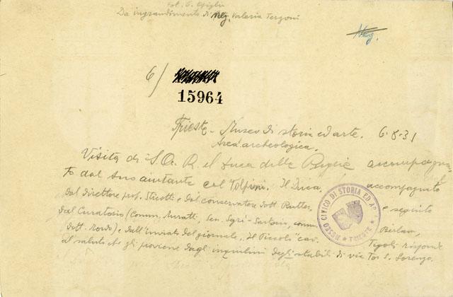 Sua Altezza reale il duca della Puglia visita l'area archeologica del Museo di Storia ed Arte di Trieste in data 8 giugno 1931. Lo accompagnano il suo aiutante colonnello Volpini, il direttore del Museo professor Sticotti e il conservatore dottor Rutter. Con lui anche il Curatorio (comm. Muratti, sen. Sagrè Sartorio, comm. Berlam, dott. Mordo) e l'inviato del giornale "Il Piccolo" cavalier Tigoli.Il Duca è ripreso mentre risponde al saluto degli abitanti degli edifici affacciati su via Tor San Lorenzo.