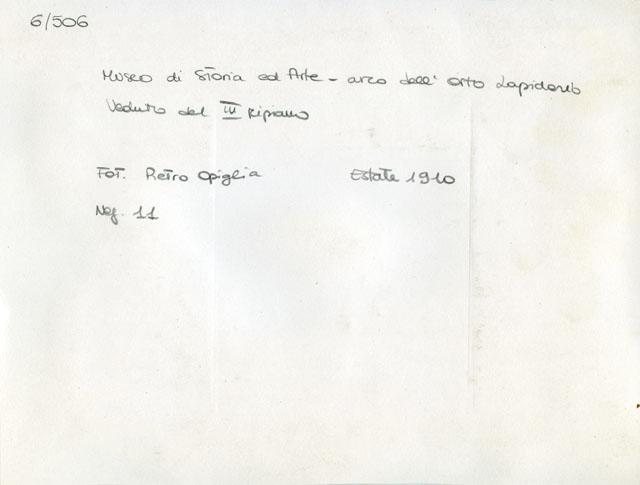 Veduta del terzo ripiano dell'Orto Lapidario dei Musei civici di Storia ed Arte di Trieste. In primo piano il camminamento tra le lapidi che attraversa il Lapidario e sullo sfondo il muro di cinta ad archi ciechi con le iscrizioni murate e il tempietto neoclassico che ospita il cenotafio di J.J. Winckelmann.