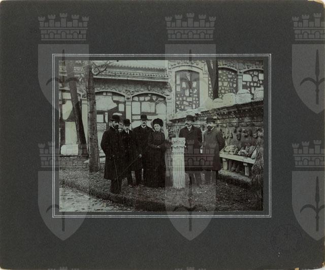 Il Curatorio del Museo di Storia ed Arte in posa nell'Orto Lapidario. L'iscrizione apposta sul retro della foto permette di identificare, da sinistra, Francesco Basilio, Giovanni da Scaramangà, il professore Alberto Puschi, direttore del Museo di Storia ed Arte, la baronessa Nina Morpurgo, l'architetto Enrico Norblio e il professore Piero Sticotti, conservatore del Civico Museo di Storia ed Arte.