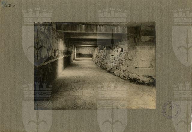 Aula Nord della Basilica teodoriana di Aquileia costruita dal Vescovo Teodoro all'inizio del IV sec. d.C., poco dopo l'editto di Costantino (313 d.C.). La foto ritrae la porzione centrale dell'aula, nel settore compreso tra il perimetrale nord e le fondazioni del campanile costruito dal patriarca Poppone all'inizio dell'XI secolo, in un'epoca successiva alla stesura del mosaico. Il pavimento mostra una composizione ortogonale di ottagoni irregolari e di croci adiacenti, con le croci ornate da trecce, gli esagoni da un fiorone composito di petali affusolati e loti trifidi e gli ottagoni campiti da motivi figurati di vario tipo. I resti dell'aula nord furono messi in luce negli anni della prima guerra mondiale e poco dopo la fine del conflitto furono protetti da una copertura in cemento armato.