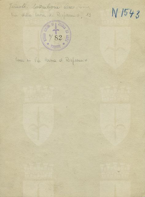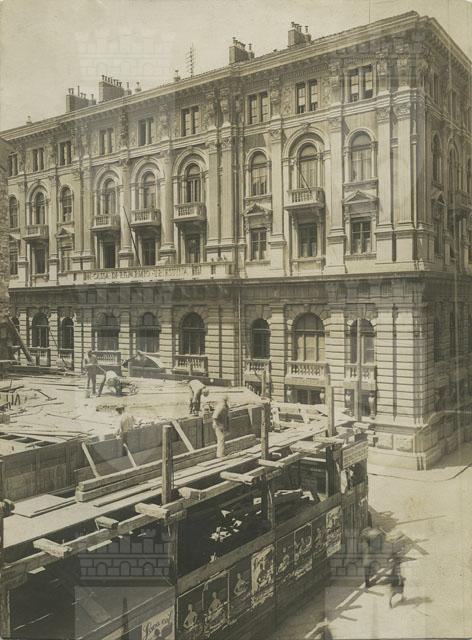 Cantiere per la costruzione della casa in via della Cassa di Risparmio, 13. Davanti al cantiere vi è l'imponente edificio della Casa di Risparmio, situato al civico 10 della via omonima, progettato dall'architetto Enrico Nordio nel 1891 e inaugurato nel 1894.