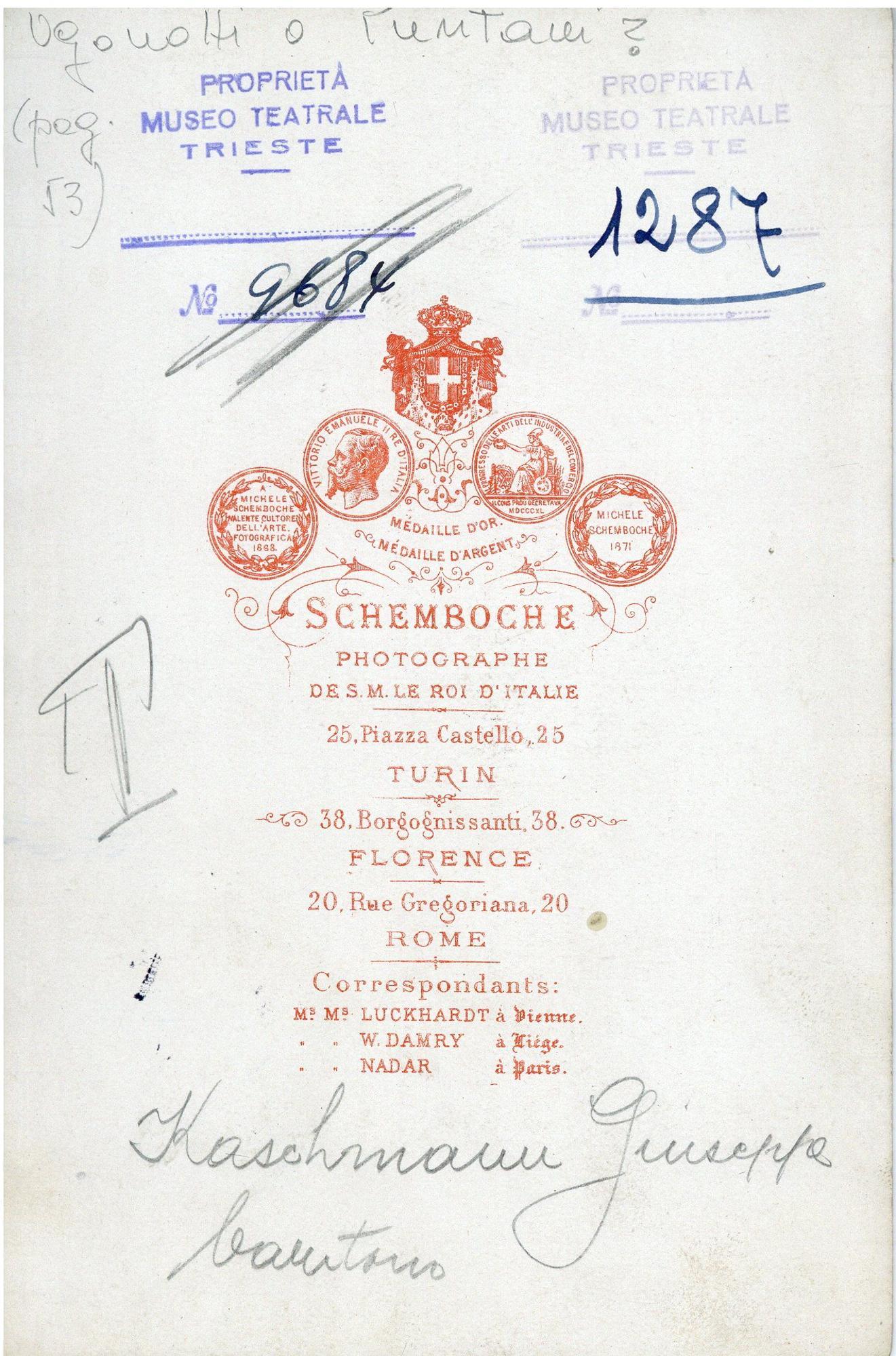 In costume, dalle note sul verso in " I Puritani" [teatro Regio di Torino nel 1877] o "Gli Ugonotti". A Trieste si è esibito al Teatro Comunale nel 1877 in "Gli Ugonotti", nel 1908 in "Il Battista", e nel 1912 in "Don Pasquale" e "L'elisir d'amore"; nel 1910 al Politeama Rossetti nel ruolo di Scarpia nella "Tosca"