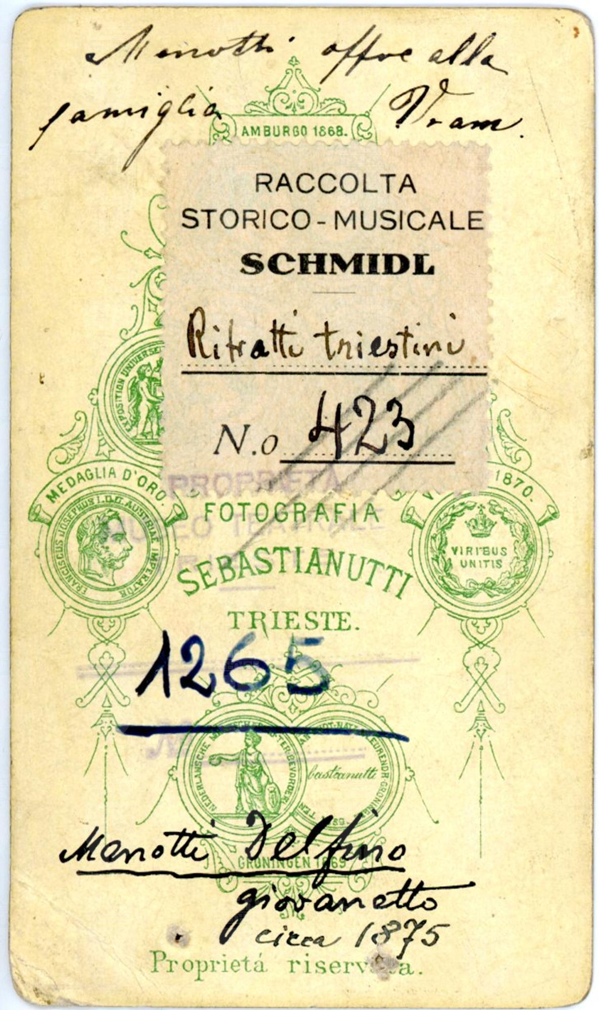 Nato a Fiumicello, Domenico Giovanni Battista Menotti, in arte Delfino Menotti, su consiglio di F. Faccio, intraprese gli studi musicali prima a Milano presso la scuola del maestro A. Sangiovanni poi a Trieste, dove riprese gli studi con G. Rota. Venne arrestato perché trovato in possesso di una lettera compromettente per G. Oberdan. Rimase in carcere cinque mesi, quindi venne processato e condannato a sei settimane di detenzione e all'esilio./pNel 1880 debuttò al teatro alla Pergola di Firenze nella Linda di Chamounix di G. Donizetti. Venne poi scritturato dal Colón di Buenos Aires, e Giuseppe Verdi, che lo aveva ascoltato a Milano, gli inviò lo spartito del Simon Boccanegra perché ne fosse il primo interprete in Argentina. Dopo una intensa attività nelle Americhe, in Europa e Russia, nel 1904 fu chiamato ad Odessa, per insegnare canto presso il conservatorio; qui sposò una sua allieva, Antonida Trouien. Nel 1920 Si stabilì a Trieste dove gli fu offerta la cattedra di canto presso il locale conservatorio e dove divenne anche direttore artistico del Teatro Verdi.