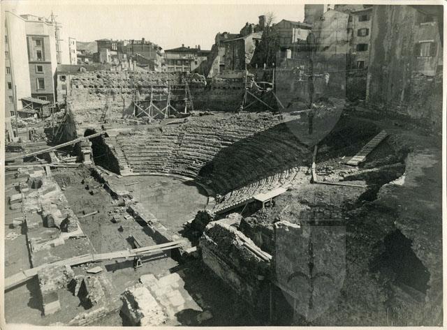 Il teatro romano di Trieste in fase di scavo. La foto è stata scattata durante l'ultimo periodo di scavo, in prossimità dell'inaugurazione del monumento avvenuta il 21 aprile del 1938. Il teatro è infatti quasi interamente alla luce, la cavea e l'orchestra sono visibili, si sta invece completando la rimozione dell'interro in corrispondenza dell'iposcenio, dove si nota ancora la presenza di uno spesso riporto.