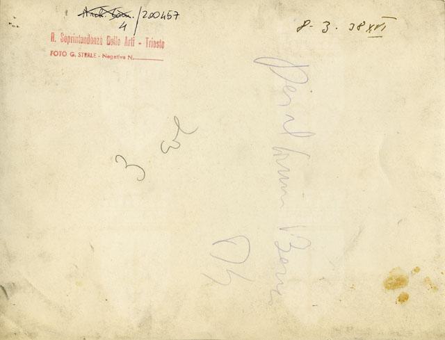 Veduta dello scavo del teatro romano nella zona di Donota in Cittavecchia ripresa dall'estremità sud-occidentale della cavea. La foto, scattata l'8 marzo del 1938, permette di constatare lo stato di avanzamento dei lavori che si concluderanno di lì a poco, il 21 aprile successivo, data dell'inaugurazione del monumento e della sua apertura al grande pubblico. Al momento dello scatto lo scavo ha messo in luce il muro perimetrale della cavea, la gradinata fino all'orchestra e sta proseguendo in corrispondenza della zona dell'orchestra e del frontescena, in corrispondenza del quale iniziano ad emergere i primi resti del muro di fondo.