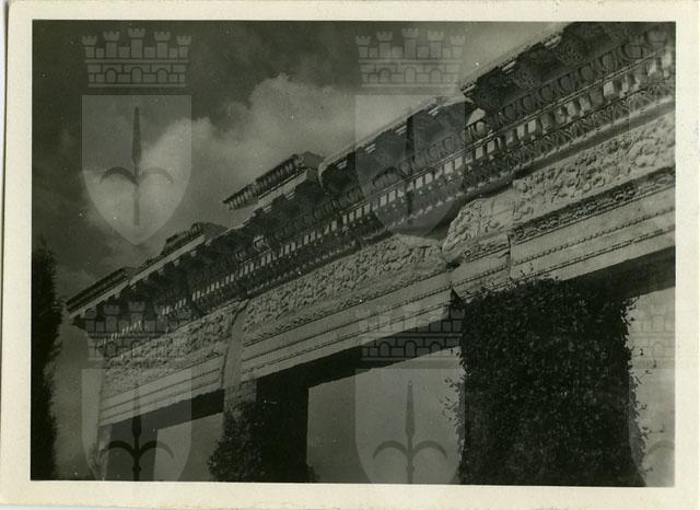 Trabeazione marmorea (II sec. d.C.) rinvenuta durante gli scavi del porto fluviale di Aquileia, innalzata su robusti pilastri di mattoni lungo il percorso della Via Sacra nel 1934.