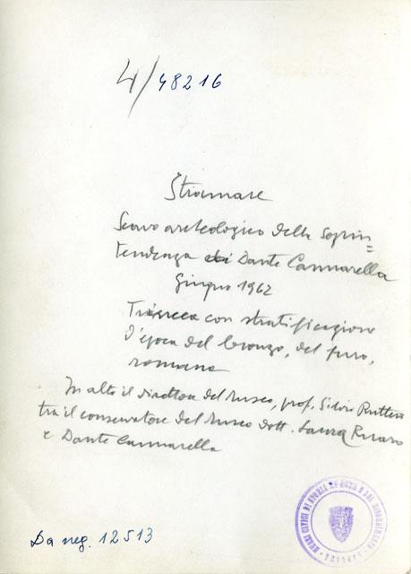 Scavo archeologico di Stramare realizzato dalla Soprintendenza sotto la direzione di Dante Cannarella tra il 1962 e il 1964. /pLa trincea mostra in sezione una stratificazione che dall'età romana risale all'età del Ferro e a quella del Bronzo. In visita allo scavo sono il direttore del Museo, il professore Silvio Rutteri, tra il consevatore del Museo, la dottoressa Laura Ruaro, e Dante Cannarella.