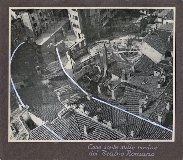 Foto scattata dalla sommità del grattacielo nel 1937, alla vigilia degli scavi per il recupero del teatro romano. La foto mostra le case sorte sui resti del teatro nell'area di Riborgo e Donota in Cittavecchia che verranno abbattute per riportare alla luce il monumento. Le linee bianche identificano il tracciato delle murature antiche rispettato dalle soprastanti costruzioni.