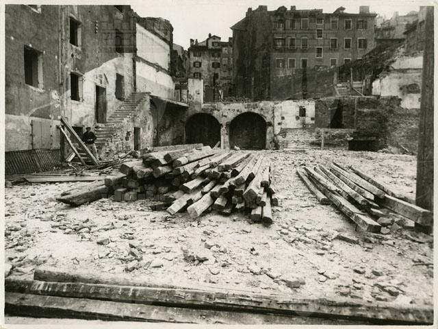 Demolizione degli edifici sorti sui resti del teatro romano nelle zone di Riborgo e Donota in Cittavecchia. La foto, scattata nel 1937, anno in cui iniziò lo sbancamento sistematico dell'area occupata dal monumento, riprende il settore interessato dall'estremità occidentale della cavea del teatro. Le operazioni di scavo, durate due soli anni, dal 1937 al 1938, permisero di mettere in luce il monumento antico nella sua intera estensione.