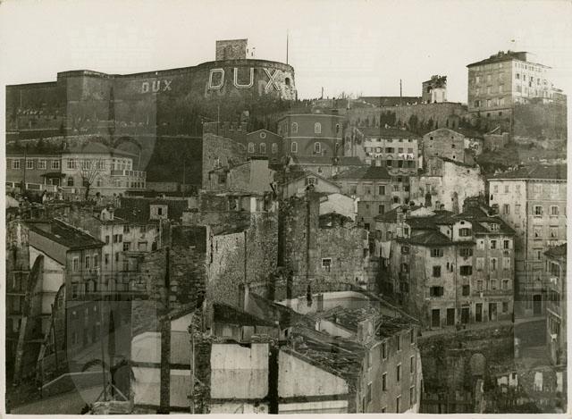 Prime demolizioni in Cittavecchia, nelle zone di Riborgo e Donota, per lo scavo del teatro romano. Del monumento è visibile, sulla destra, il tratto del muro perimetrale (tratto sud) messo in luce nel 1934 durante le prime operazioni di sventramento avvenute sotto la direzione del podestà Enrico Salem a seguito dell'approvazione del piano regolatore.