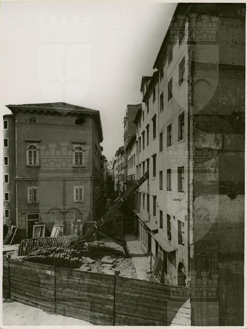 Tratto iniziale di via Beccherie, nei pressi di largo Riborgo, compreso nel piano di ristrutturazione urbanistica di Cittavecchia. Sulla destra c'è piazza della Borsa 10, a sinistra il Tempio israelitico ancora in piedi.