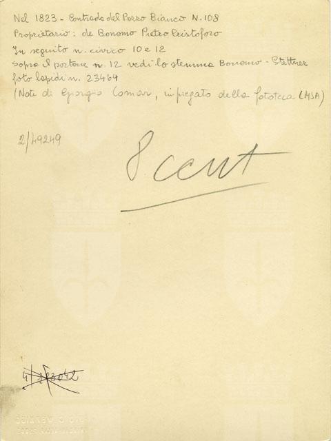 Edificio di contrada del Pozzo Bianco di proprietà di Bonomo Pietro Cristoforo, commissario di guerra alla marina. Sopra il portone al civico 12 si vede lo stemma della famiglia ascritta nelle tredici nobili casate di Trieste.