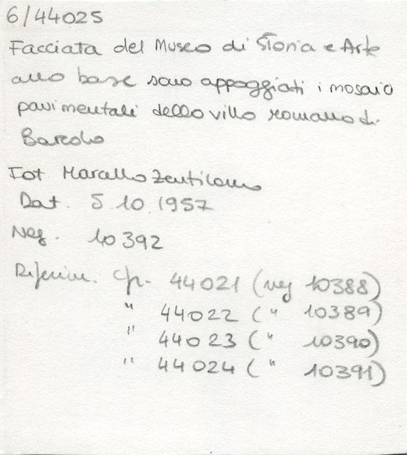 Facciata del Museo di Storia ed Arte di Trieste con appoggiati i mosaici provenienti dalla villa romana di Barcola. La villa fu scavata tra il 1888 e il 1891 da Alberto Puschi, allora direttore del Civico Museo di Antichità, nella località di Barcola, prossima a Trieste. Le indagini misero in luce due nuclei architettonici di una villa costruita in età cesariana in posizione panoramica lungo la costa. La grandezza del complesso e la ricchezza delle decorazioni e dei mosaici suggerisce che l'edificio apparteneva a personaggi di alto rango.