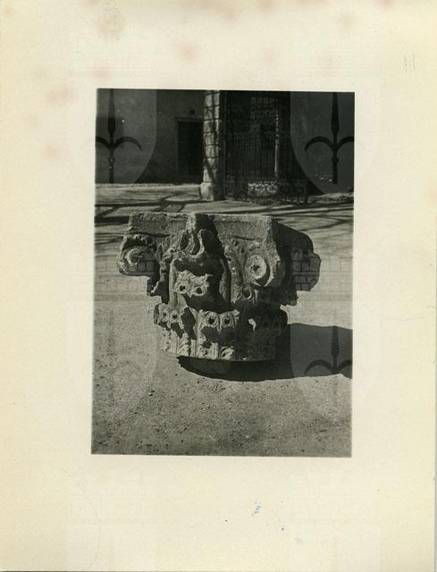Capitello di colonna in calcare di Aurisina rinvenuto ad Aquileia. Da un punto di vista tipologico l'opera riecheggia gli esemplari corinzi-italici ma se ne discosta nella resa stilistica, attribuibile a un gusto diverso. Il valore plastico che anima le creazioni italiche è qui sostituito da uno schema ornamentale geometrico piuttosto rigido che si percepisce soprattutto nel trattamento delle foglie d'acanto, tutte ugualmente stilizzate. L'esemplare è databile alla fine del IV sec. d.C.