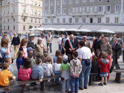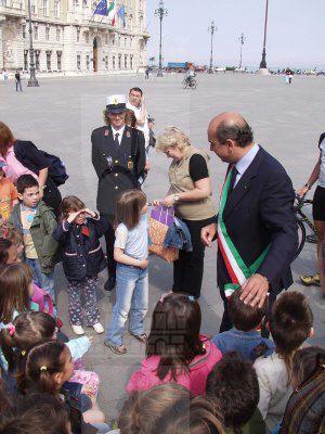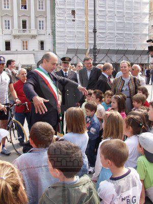 Roberto Dipiazza, sindaco intrattiene i bambini che assistevano all'incontro con i ciclisti della polizia in piazza dell'Unita' d'Italia : Trieste : 2002