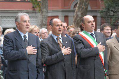 Roberto Dipiazza sindaco, gli assessori Renzo Codarin e Giorgio Rossi, I consiglieri Piero Camber, Francesco Gabrielli, Michele Lobianco, Andrea Vatta e Salvatore Porro, la Banda Refolo e Umberto Lupi all'inaugurazione