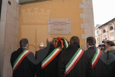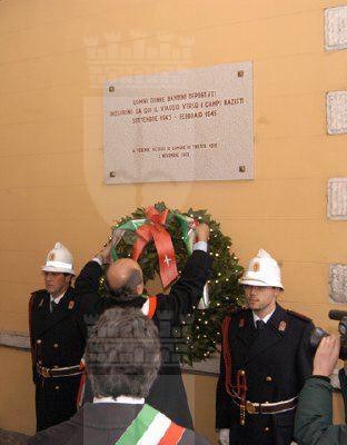 Il sindaco Roberto Dipiazza depone una corona sulla lapide in memoria delle persone deportate nei campi di concentramento nazisti partite dalla stazione di Trieste