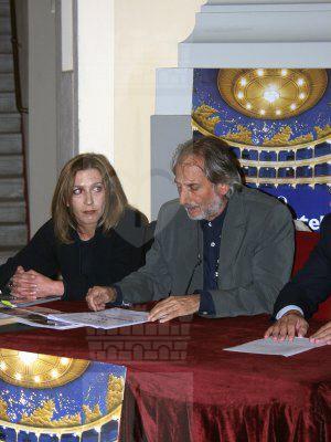 Il sindaco di Trieste Roberto Dipiazza con l'asssessore comunale Giorgio Rossi, il consigliere Paolo Rovis e l'architetto responsabile del progetto Luciano Celli durante la presentazione presso il Politeama Rossetti.