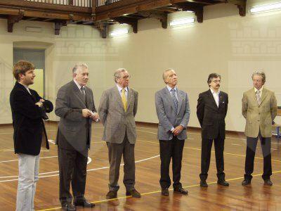 L'assessore comunale Giorgio Rossi, il consigliere Franco Bandelli ed i presidenti provinciale e regionale del Coni, Stelio Borri ed Emilio Felluga all'inaugurazione della ristrutturata palestra
