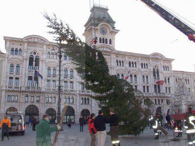 Operazioni per la posa dell'albero di Natale in piazza Unità d'Italia.