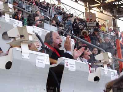 Il sindaco Roberto Dipiazza con Susanna Huckstep e Peppe Quintale durante la diretta allo stadio Nereo Rocco.