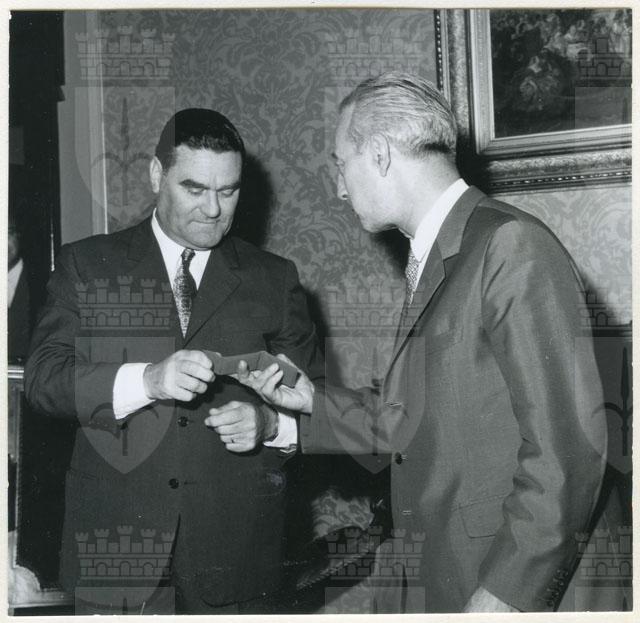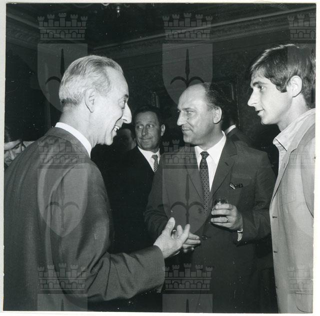 Il Sindaco ing. Spaccini riceve l'ospite accompagnato da Valcareggi, Maldini, Rivera