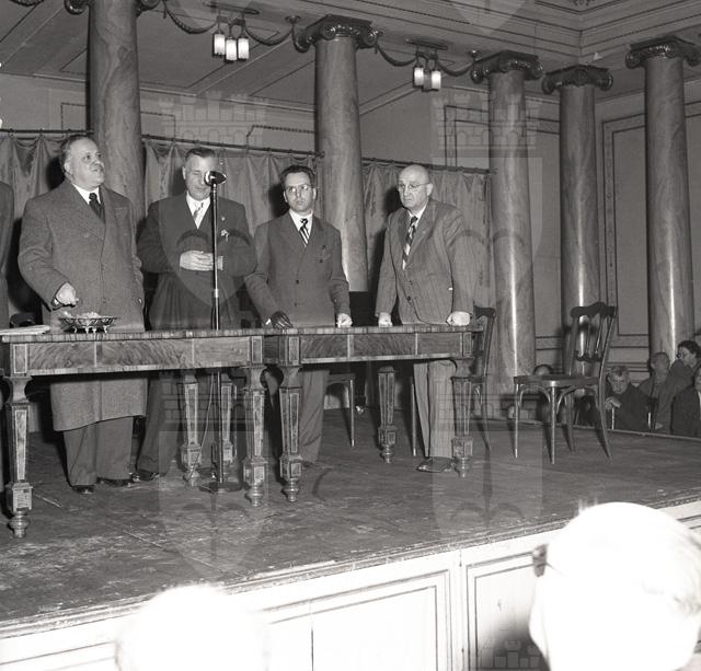 Celebrazione ufficiale il 19 marzo della Giornata nazionale del mutilato del lavoro al Ridotto del Verdi. Presente il grande invalido del lavoro, prof. avv. Filosi di Roma. Il prefetto Palutan, assistito dal direttore dell' INAIL dott. Benussi Gambel, distribuisce diplomi e distintivi agli invalidi e ai mutilati.