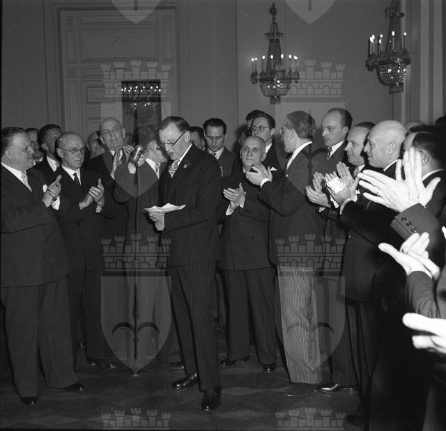 Con una solenne cerimonia in Prefettura, il maggior generale inglese sir Terence Airey si congeda dalle autorità politiche cittadine (da: Trieste 1900-1999: cent'anni di storia, v. 6, p. 184)