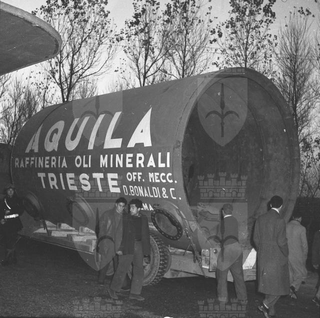 Tre camion rimorchio, giunti da Crema, trasportano un grande serbatoio destinato alla Raffineria Aquila. Il vuoto e' composto da un primo elemento lungo m 7,5 e del diametro di m 3,80, peso circa 20 tonnellate, e da un altro elemento analogo e della struttura metallica del forno. E' il primo impianto del genere costruito in Italia, su disegno di una ditta di Boston