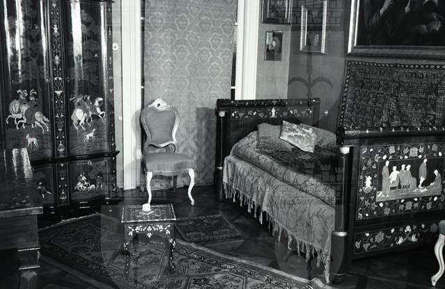 La splendida camera da letto di Draga Obrenovic, regina di Serbia, moglie del re Alessandro, composta da mobili olandesi intarsiati d'avorio. Draga e Alessandro, convolati a nozze nel 1900, furono assassinati la notte del 10 giugno 1903, proprio in questo letto: una congiura di palazzo pose fine alla dinastia degli Obrenovic, per insediare sul trono Pietro Karageorgevic. La camera appartenne a una nobile famiglia triestina e fu poi venduta a un celebre antiquario che la riallesti in una villa di viale Terza Armata, dove fu fotografata.