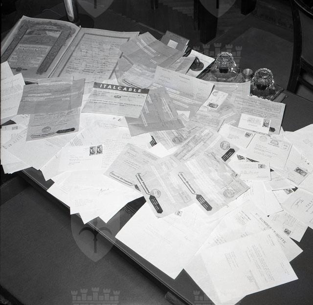 Documenti di lavoro sparpagliati su una scrivania. Gruppo di impiegati in posa all'interno di un ufficio. Pergamena celebrativa per il 40. di lavoro del direttore