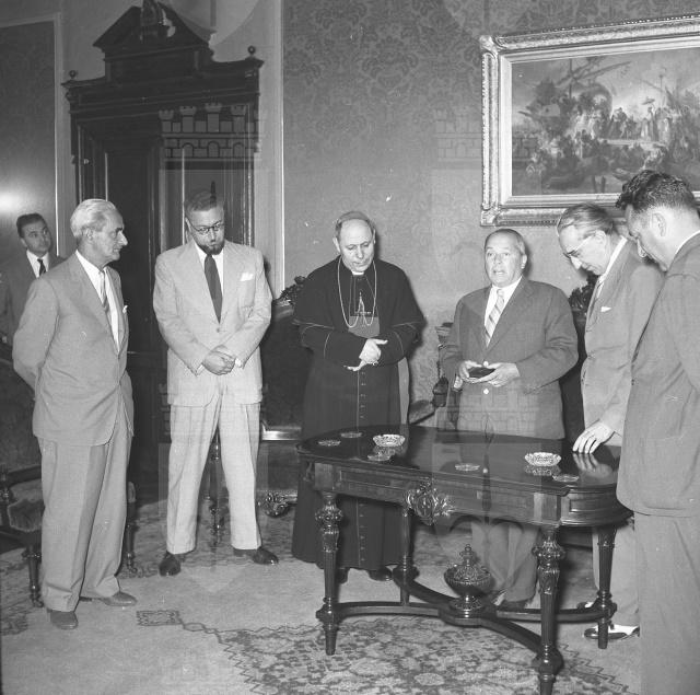 Congedo in forma ufficiale del dott. Renato Timeus, dal 1914 funzionario dell'amministrazione comunale di Trieste alla presenza del segretario generale del Comune Sacchi, del prof. Sciolis, del vescovo Santin e dell'ing. Visentin (Da: Rivista mensile della citta di Trieste, 10.9.1953)