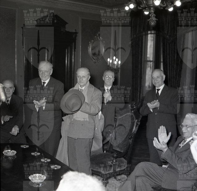 Una delegazione di 18 dei 150 studenti che nel 1904 si batterono a Innsbruck per chiedere l'istituzione a Trieste dell'Università italiana sono stati ricevuti dal Sindaco dopo aver deposto una corona d'alloro sulla lapida di Via Filzi ed essere stati accolti dal rettore dell'Università, Rodolfo Ambrosino. Testo tratto dal Piccolo sera, 16.11.1954.
