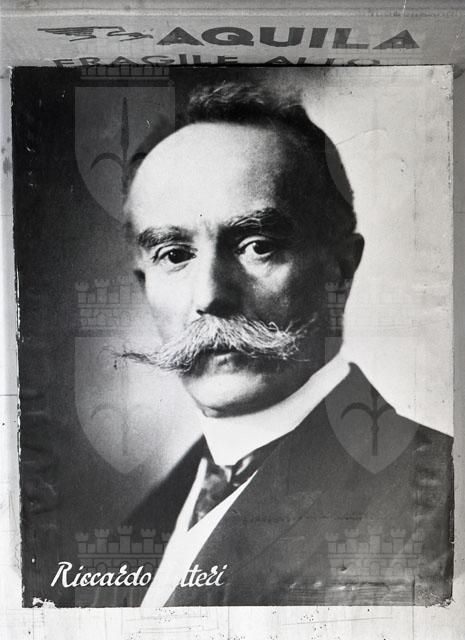 Riproduzione di fotografia di Riccardo Pitteri (Trieste 1853 - Roma 1915), presidente della sezione Adriatica della Lega nazionale dal 1901 fino al 1914, e presidente della Lega nazionale dal 1900 al 1902, nel 1904, e dal 1908 al 1910. Sul supporto sottostante la scritta Aquila