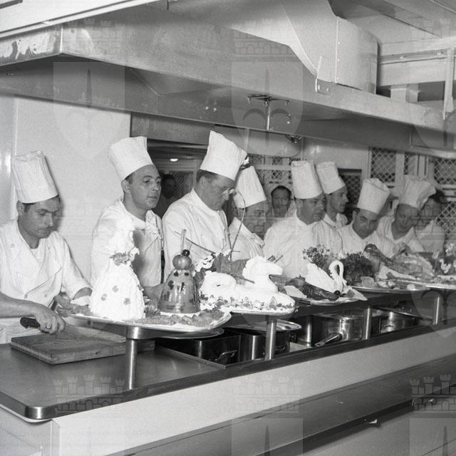 Croceristi ripresi sulla nave. Gli interni della Motonave Victoria: la cucina, il ristorante, la sala da ballo.
