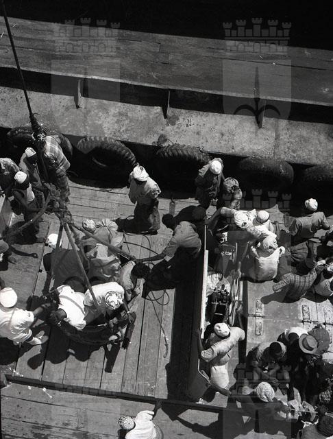 Arrivo a Mogadiscio: riprese dello sbarco; presente un'immagine del barbiere di brdo al lavoro sulla Motonave Africa.