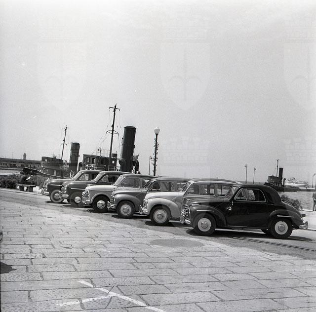 Sei automobili FIAT di vari modelli in un servizio fotografico pubblicitario commissionato dalla ditta di autonoleggi Franco e Bonetta, con sede in via Mazzini 1 a Trieste.