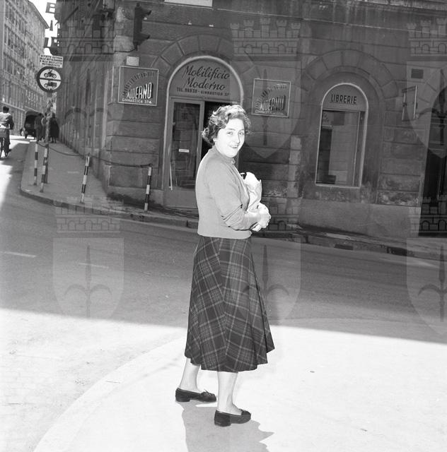 Signora ritratta in via Ginnastica davanti al Mobilificio Moderno al n. 37a