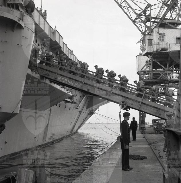 Alla vigilia dell'arrivo dei soldati italiani le ultime truppe britanniche si imbarcano, unitamente ai loro mezzi, su una portaerei, ormeggiata poco distante dall'idroscalo (da: Ugo Borsatti, Trieste 1954, fotografie dell'Archivio Storico "Foto Omnia" di Ugo Borsatti di proprieta' della Fondazione CRTrieste, Trieste, Lint, 2004, p. 66-67).