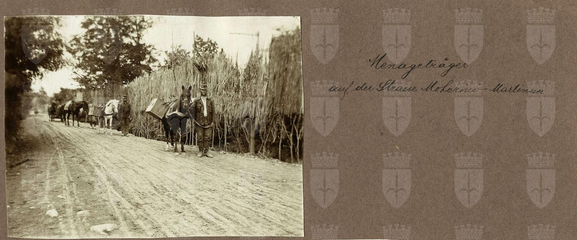 Trasporto vettovaglie sulla strada che conduce a Mohorini e Martinucci Mohorini e Martinucii (italiano Mogorini e Martinucci) agglomerati di Rence (italiano Ranziano) nella valle del Vipacco, oggi in gran parte in Slovenia, importante via di rifornimento militare austriaco con numerosi centri di comando. Martinucci ospitava anche un ospedale da campo