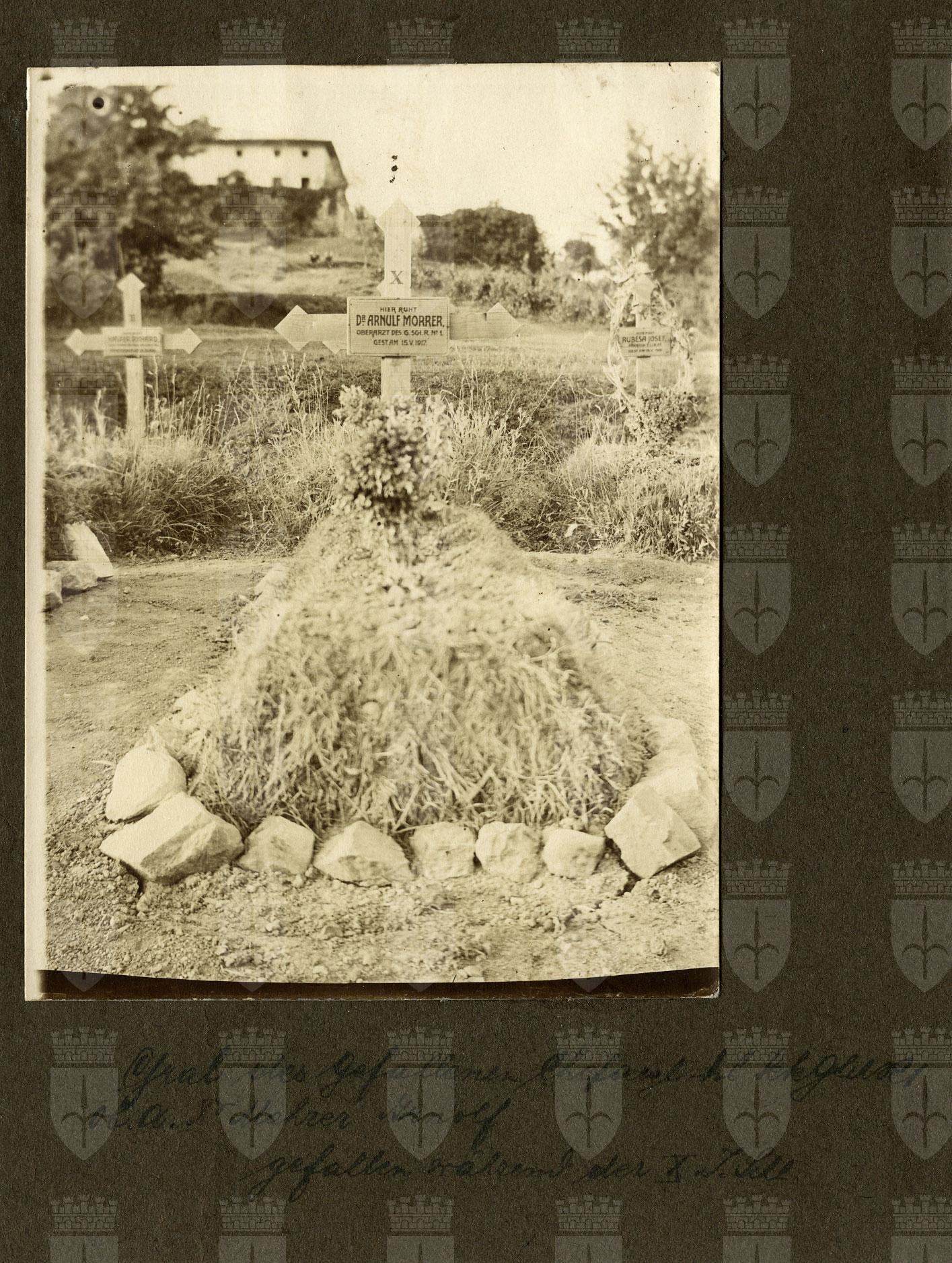 Cimitero di guerra Grab des gefallenen Chefartz k.k. GschR1 Ob. A. Dr. Mahrer Arnolf gefallen während der X I. Schl : Tomba del primario Dr. Arnolf Mahrer, Capo medico dell'imperial regio 1. Reggimento dei Fucilieri di Montagna, caduto durante la X Battaglia dell'Isonzo