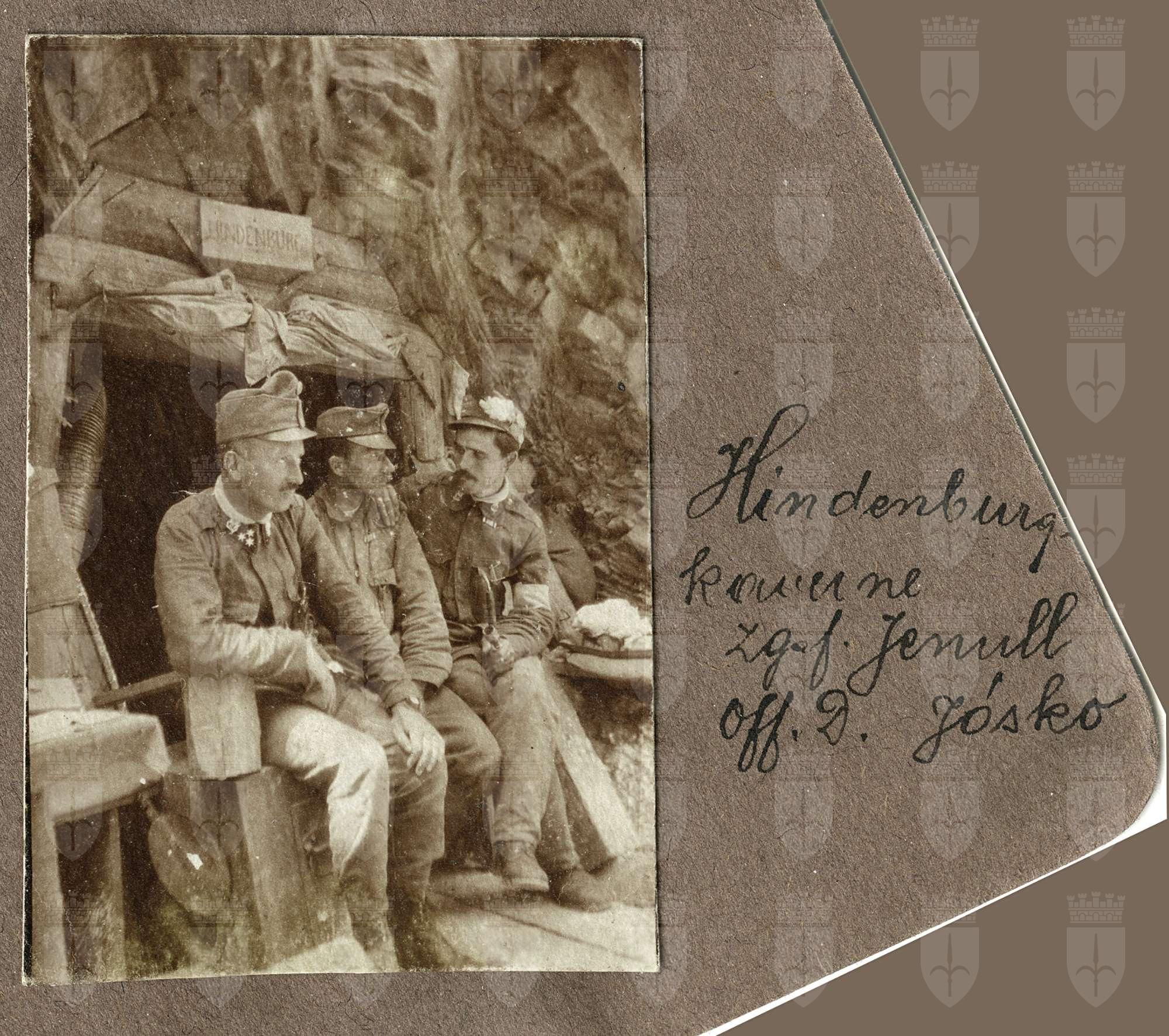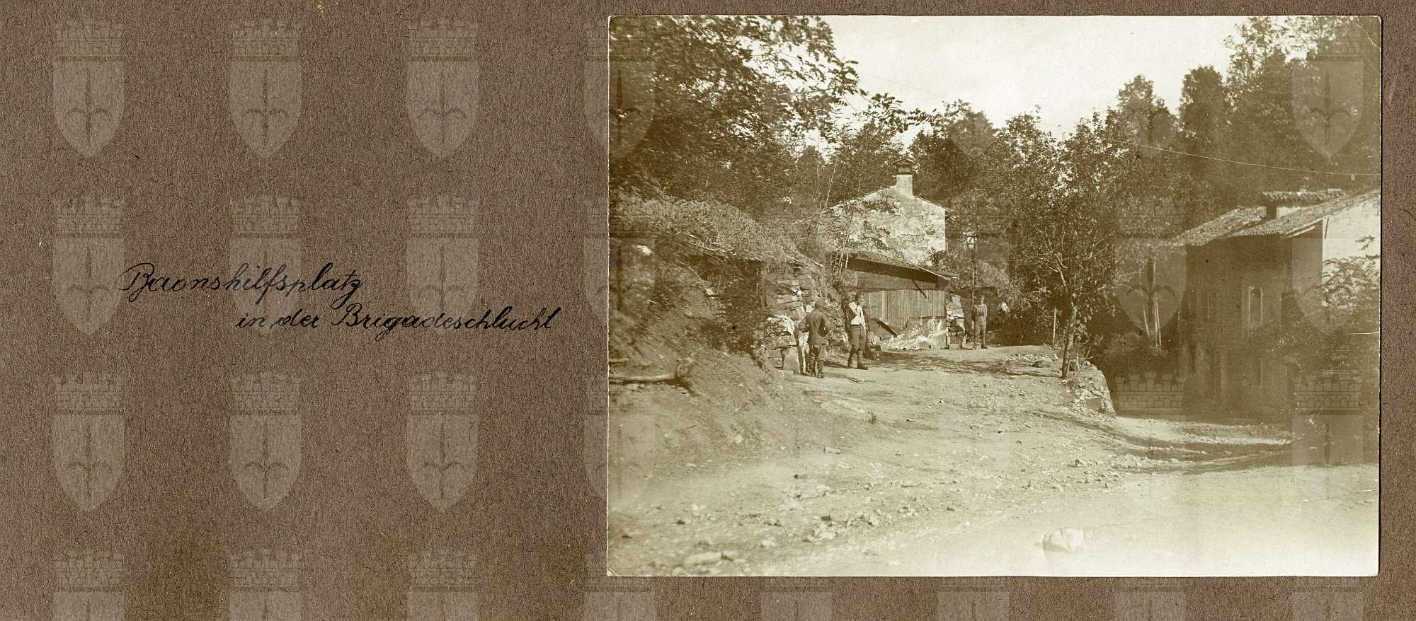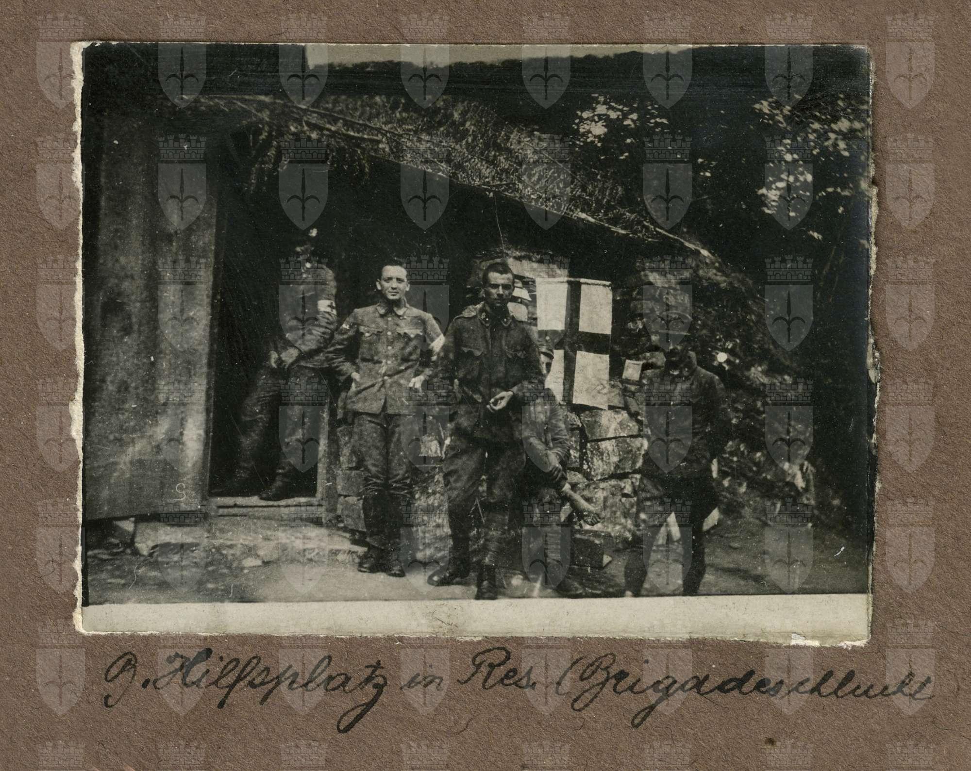 "Posti di soccorso" Mario Slavich e altri quattro soldati all'esterno di un Hilsplatz Mario Slavich (con il camice) con un altro soldato. Gruppo di sette soldati all'esterno di un Pronto Soccors odel Reggimento nella caverna Martinicci
