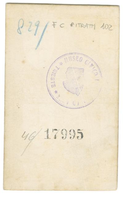 Il personaggio è raffigurato a figura intera ed è posto leggermente verso sinistra con il busto voltato frontalmente, un braccio è appoggiato su un ripiano da cui sporge una trave e una mano tiene il cappello: indossa la camicia garibaldina con un fazzoletto annodato attorno al collo e calzoni bianchi fermati da una stretta cintura; è in piedi, accanto una pietra.