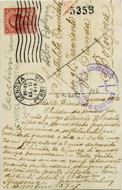 Franco Cecchini, nato a Trieste nel 1894, volontario irredento 6° Rgt. Bersaglieri. Nome da assumersi dall'arruolato: Rovighi Dante di Alberto Via Mazzini 45