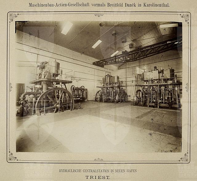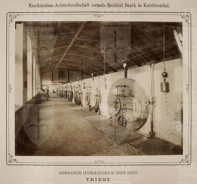 Nel 1891 la Centrale Idrodinamica entra in funzione e fornisce l’energia per il funzionamento di arredi meccanici, gru e montacarichi azionati da acqua sotto pressione1. La fotografia entra nel porto, immortalando l’edificio non solo all’esterno ma anche all’interno, mettendo in risalto la meravigliosa volumetria futurista e la modularità geometrica dei macchinari industriali. I positivi di grandi dimensioni sono elegantemente incollati sul supporto secondario che riporta in alto, al centro, il nome della ditta Maschinenbau-Actien-Gesellschaft vormals Breitfeld Danek in Karolinenthal responsabile della costruzione dei macchinari che ancora oggi si possono ammirare. Le caldaie tipo Cornovaglia, realizzate nel 1891, saranno utilizzate fino al 1988. Testo tratto dal saggio: Vedute e visioni di Porto Vecchio negli scatti della Fototeca dei Civici Musei di Storia ed Arte di Trieste