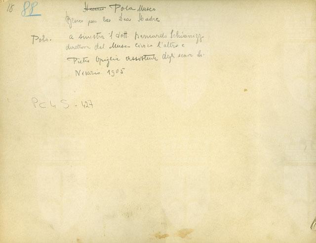 Pietro Opiglia con Bernardo Schiavuzzi (Pirano 1865-Pola 1929), direttore del museo di Pola, nel 1903 davanti al frontone del cosiddetto tempio di Eia, trovato a Nesazio e trasportato a Pola nel museo.