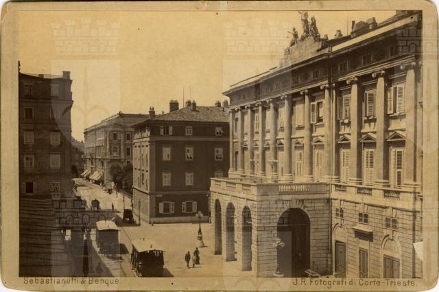 Sulla destra, in sequenza: il Palazzo del Lloyd Austriaco, il giardino di Piazza Grande, scomparso nel 1919, e la vecchia sede della Luogotenenza, demolita nel 1904. In primo piano il teatro eretto nel 1801 col nome Teatro Nuovo, poi ribattezzato nel 1819 Grande, nel 1861 Comunale e, il 27 gennaio 1901, il giorno stesso della morte del compositore, Verdi. Sulla sinistra si vedono i tramway a cavalli su rotaia, servizio cessato nel 1900